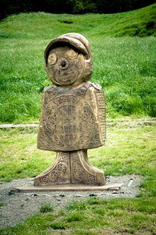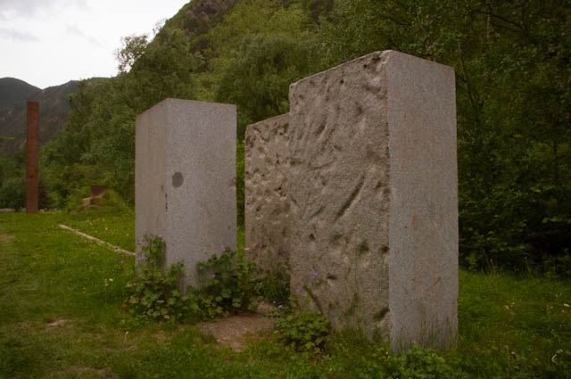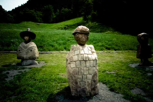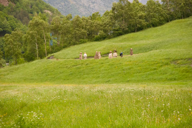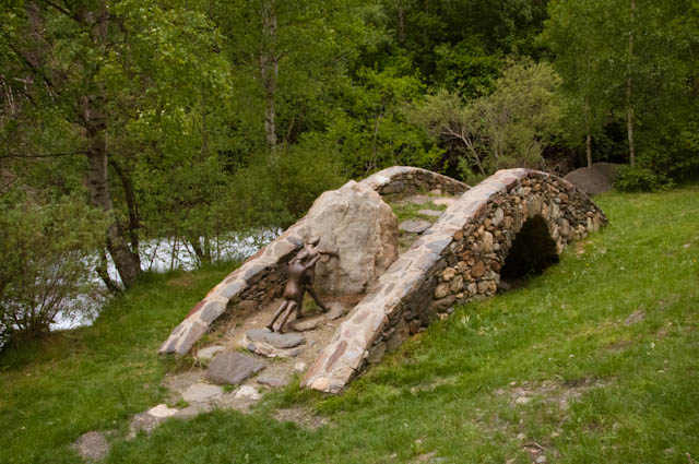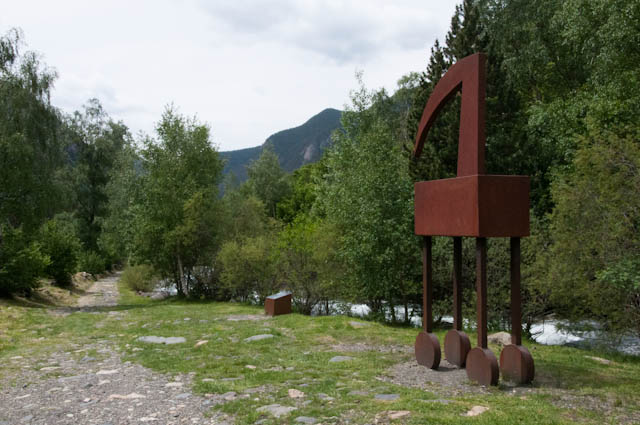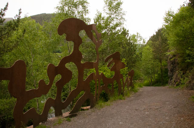 La excursió doncs la vam començar a la sortida del poble de Llorts, deixant el cotxe en un pàrquing petit però perfectament habilitat per al seu propòsit. Curiosament no érem pas els únics que havíem tingut la mateixa pensada. Només baixar ja et trobes de morros amb la mina de ferro de Llorts. No es pot dir que sigui espectacular la dimensió del forat però ja et vas fent una idea i t’ajuda a situar-te. Després, resseguint un camí planer i inequívoc direcció sud anem trobant escultures de diferents autors relacionades amb el ferro i el metall. Impressionant. A més són artistes internacionals, que no deixa de ser curiós (argentins, japonesos…). Durant la major part del trajecte es segueix literalment i de manera absolutament fidel el traçat del riu, pel que és una passejada agraïda i amb uns paisatges impagables. La Martina pràcticament va dormir tot el trajecte mentre la dúiem penjada amb aquests arnesos tan pràctics, i la Vera s’ho va passar pipa corrent amunt i avall, jugant amb tot el que trobava.